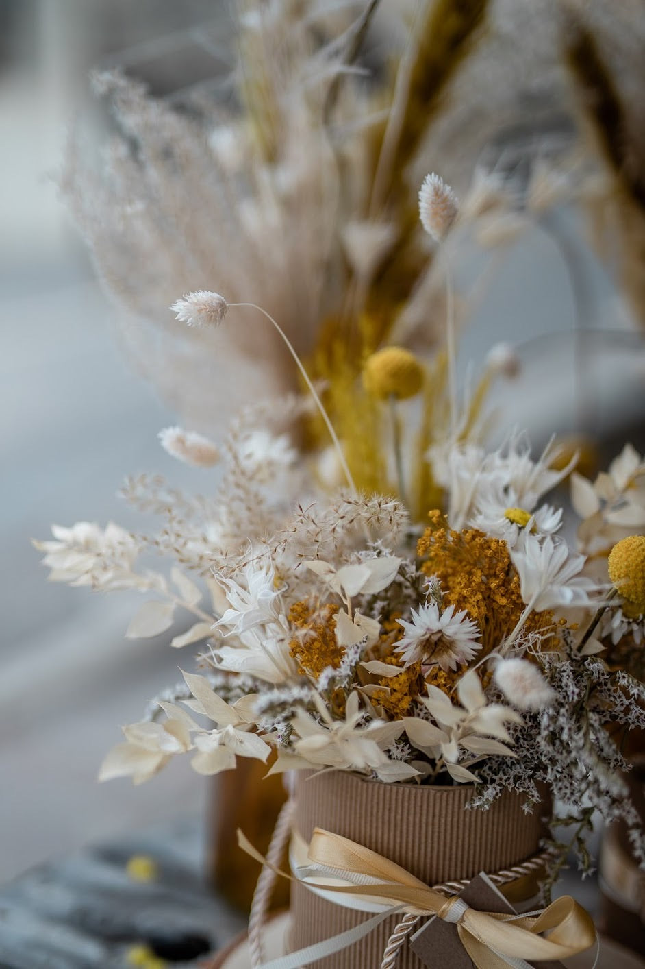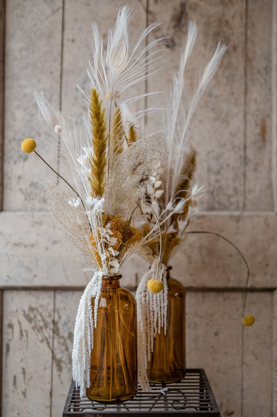 Bottiglia in vetro ambrato con fiori stabilizzati