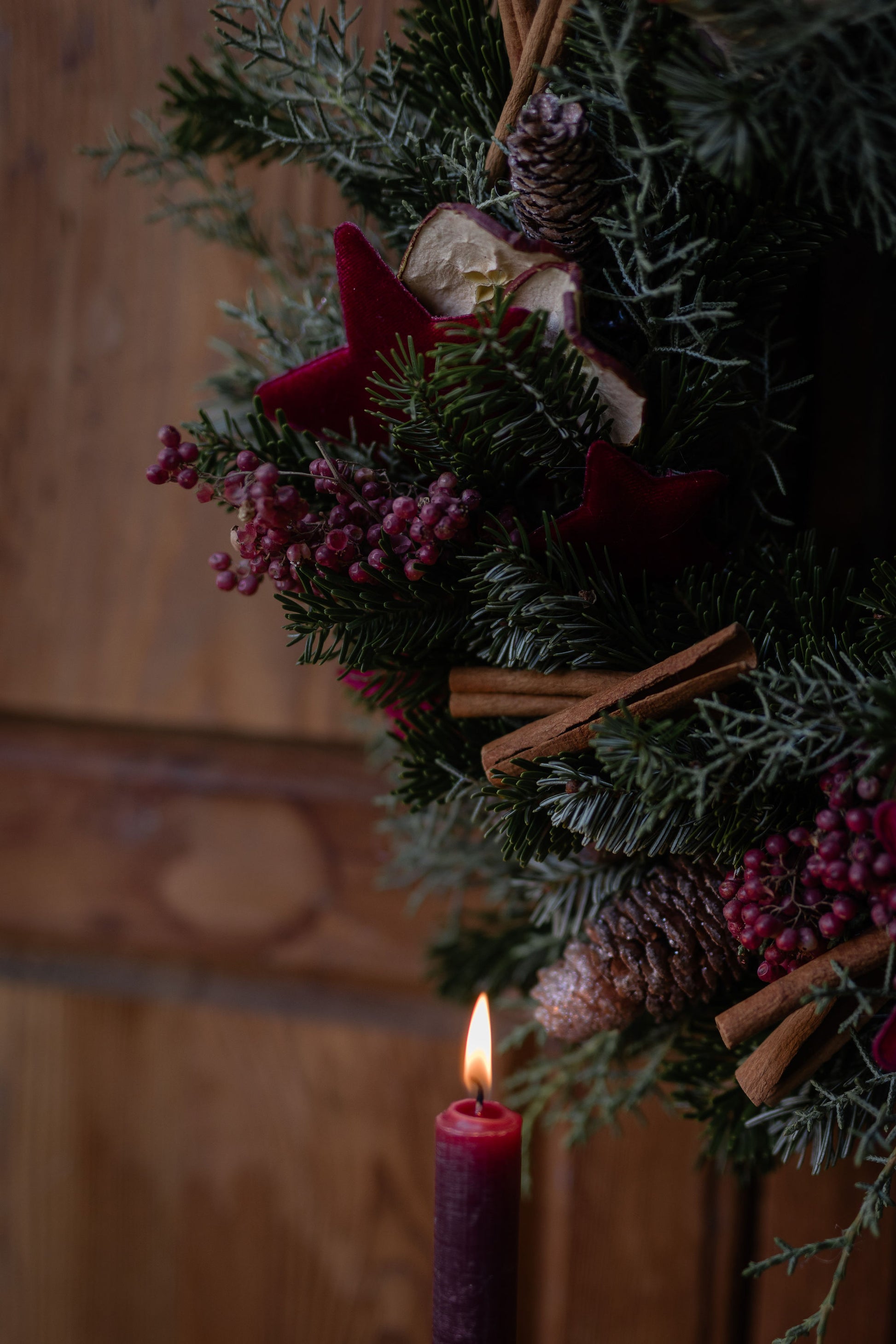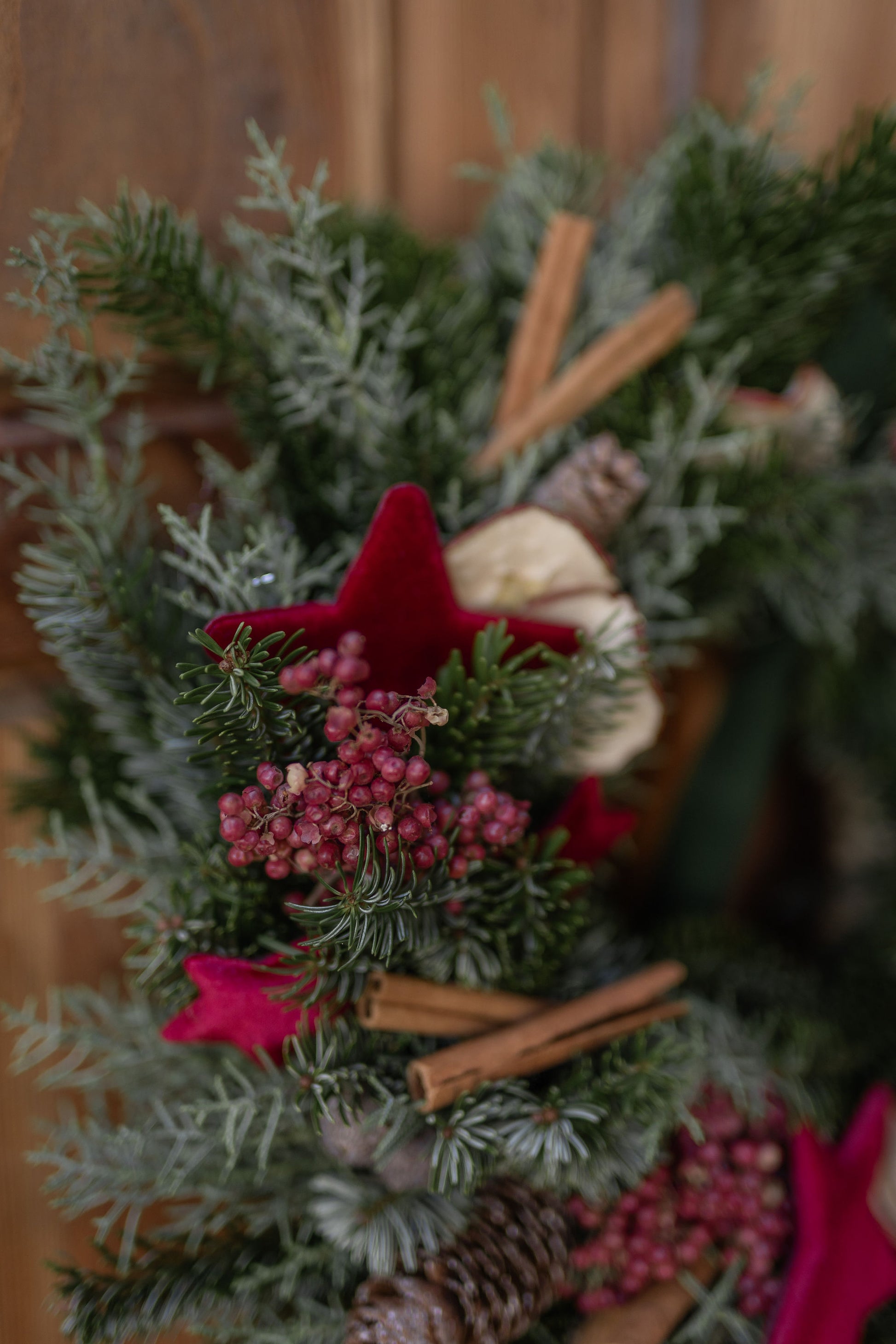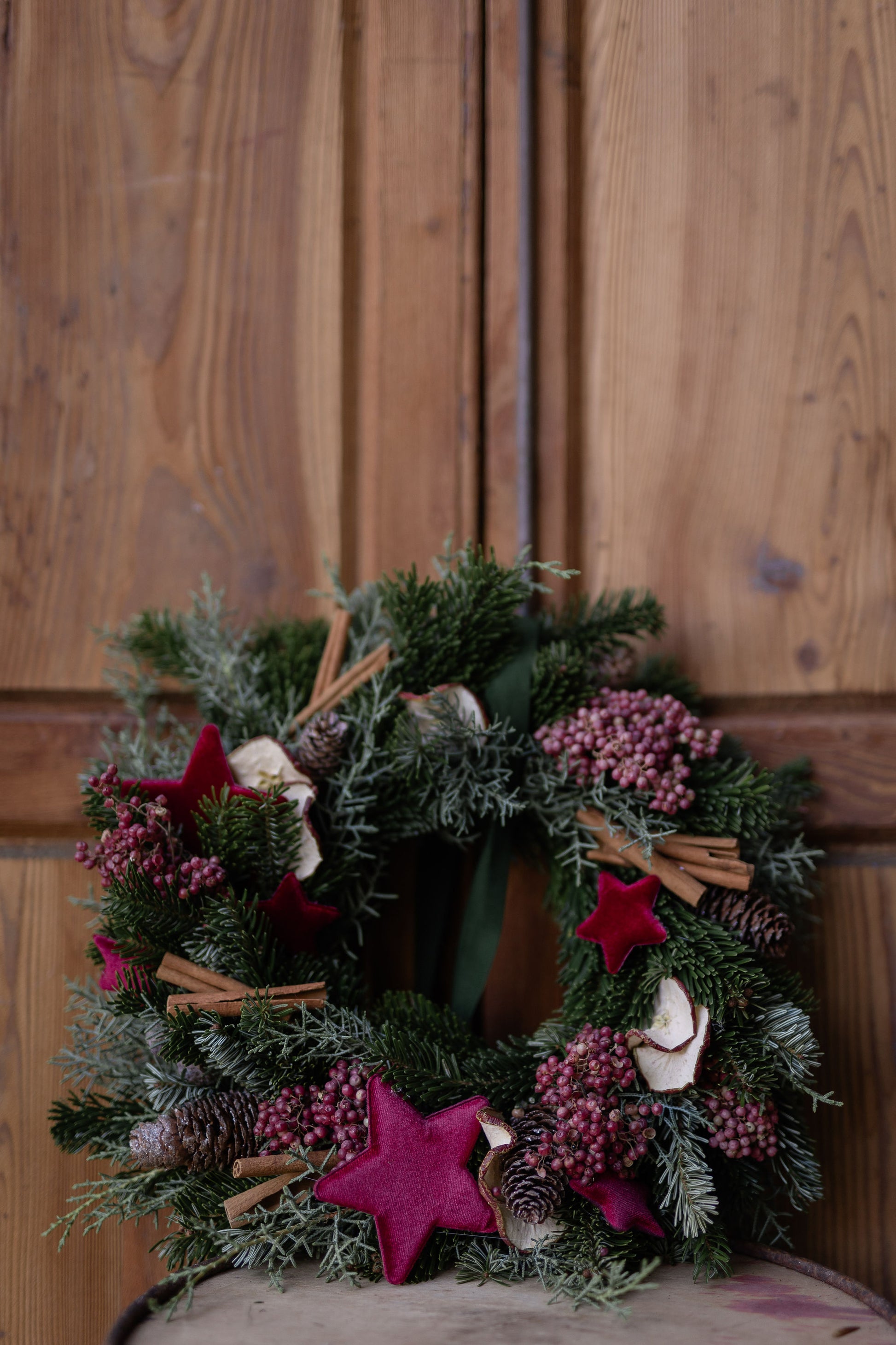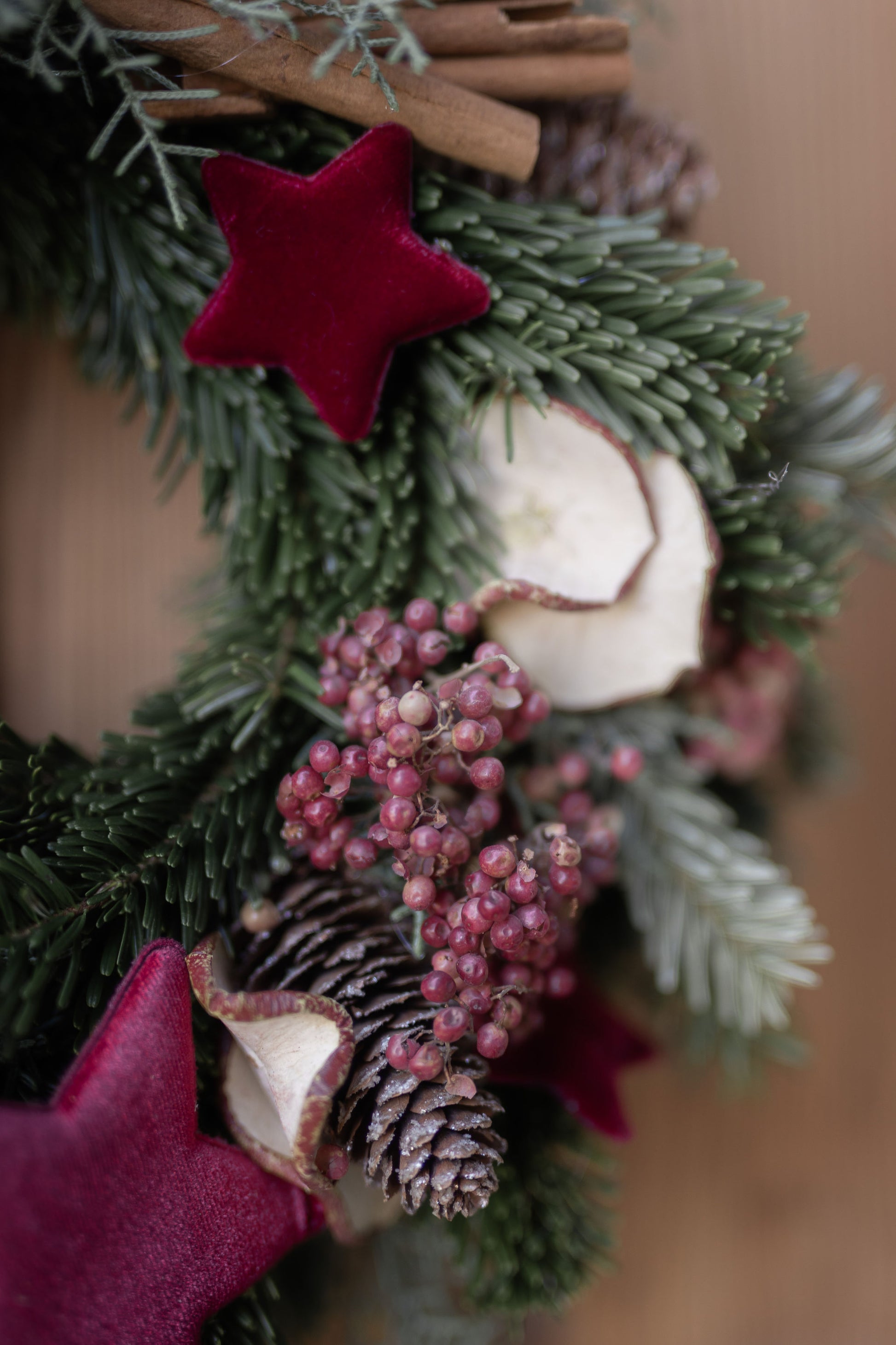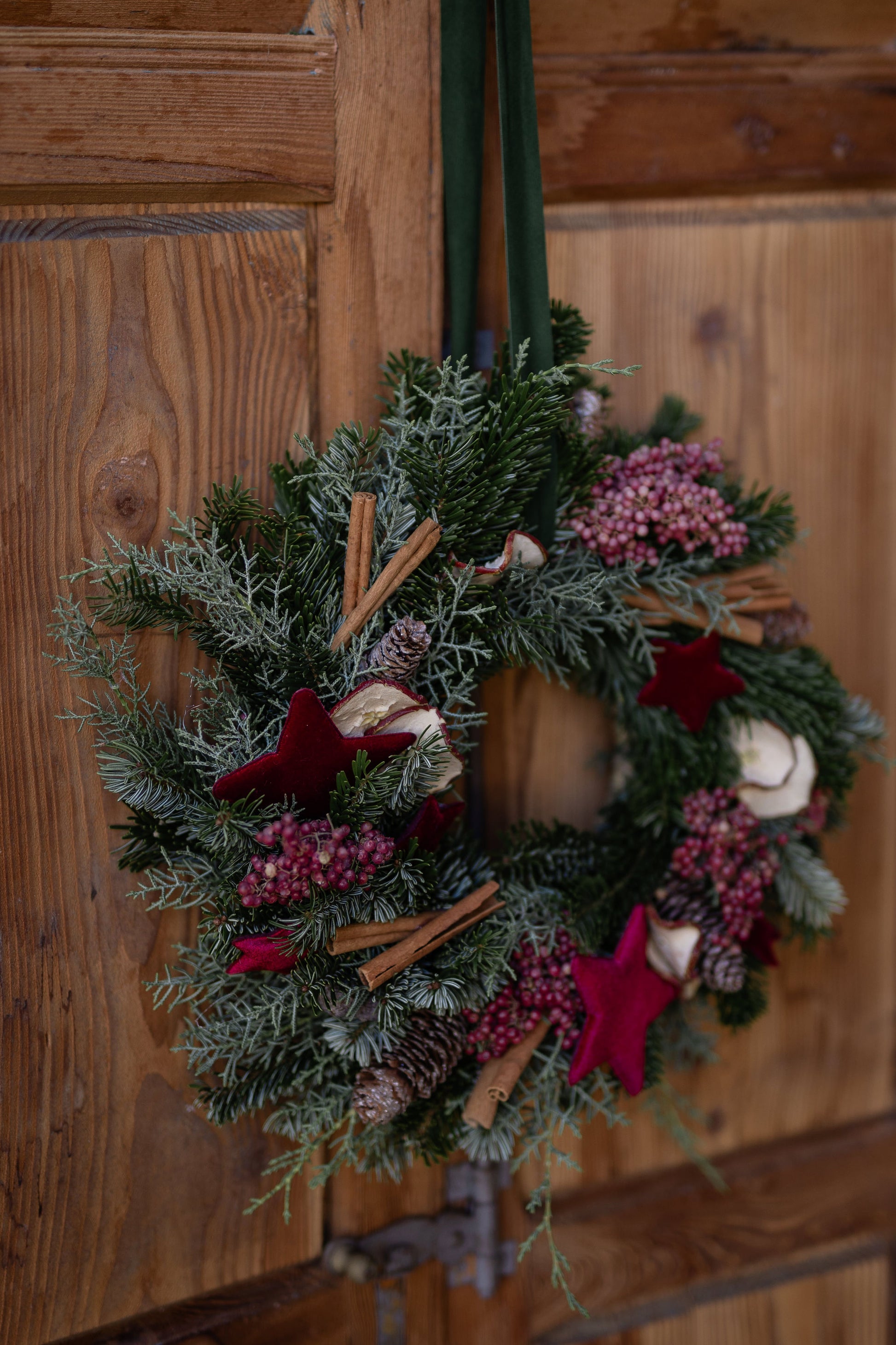 Una ghirlanda intrecciata a mano con almeno due tipologie diverse di verde e decorata con cannella, mela essicata, pepe rosa e delle elegantissime stelle di velluto bordeaux.