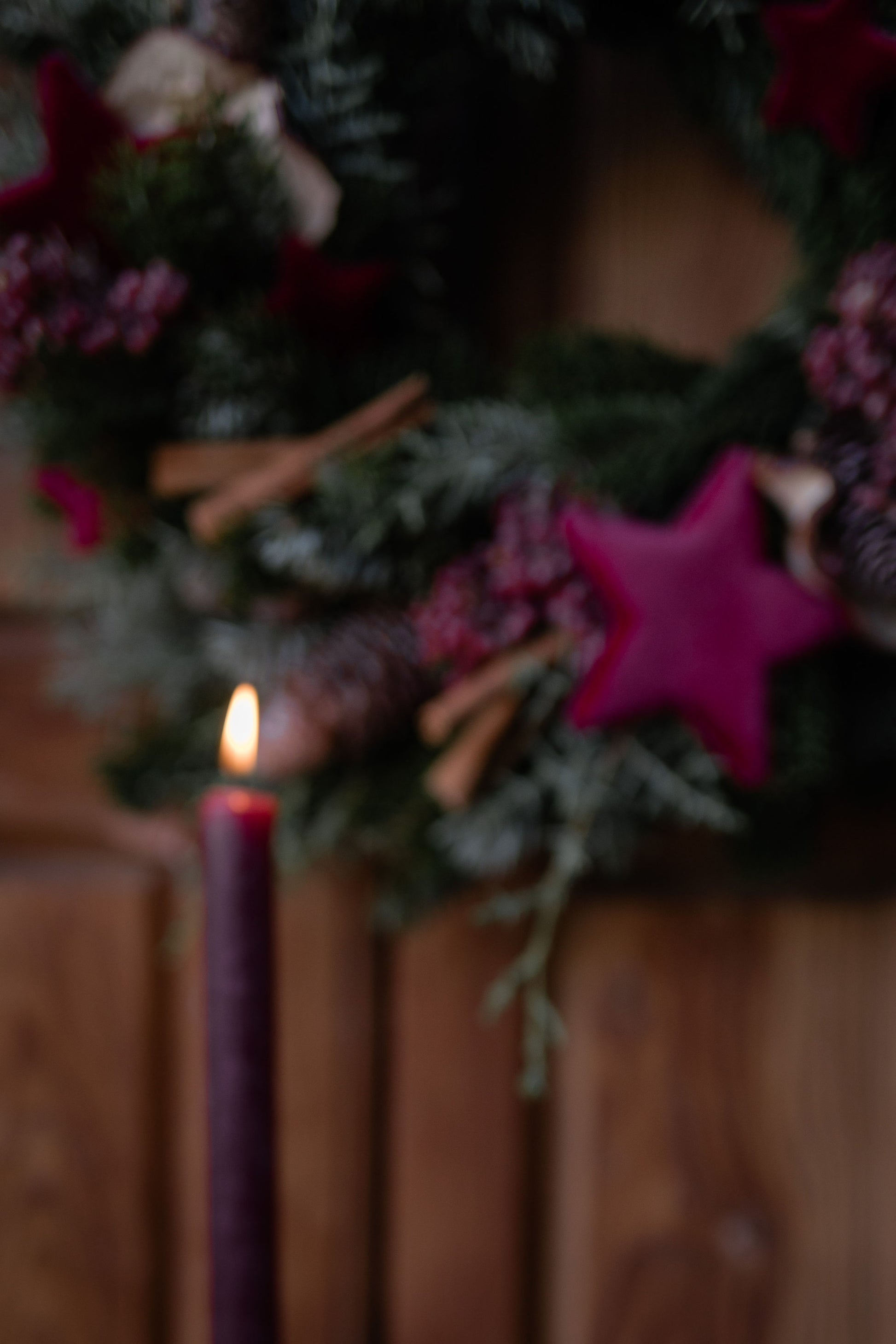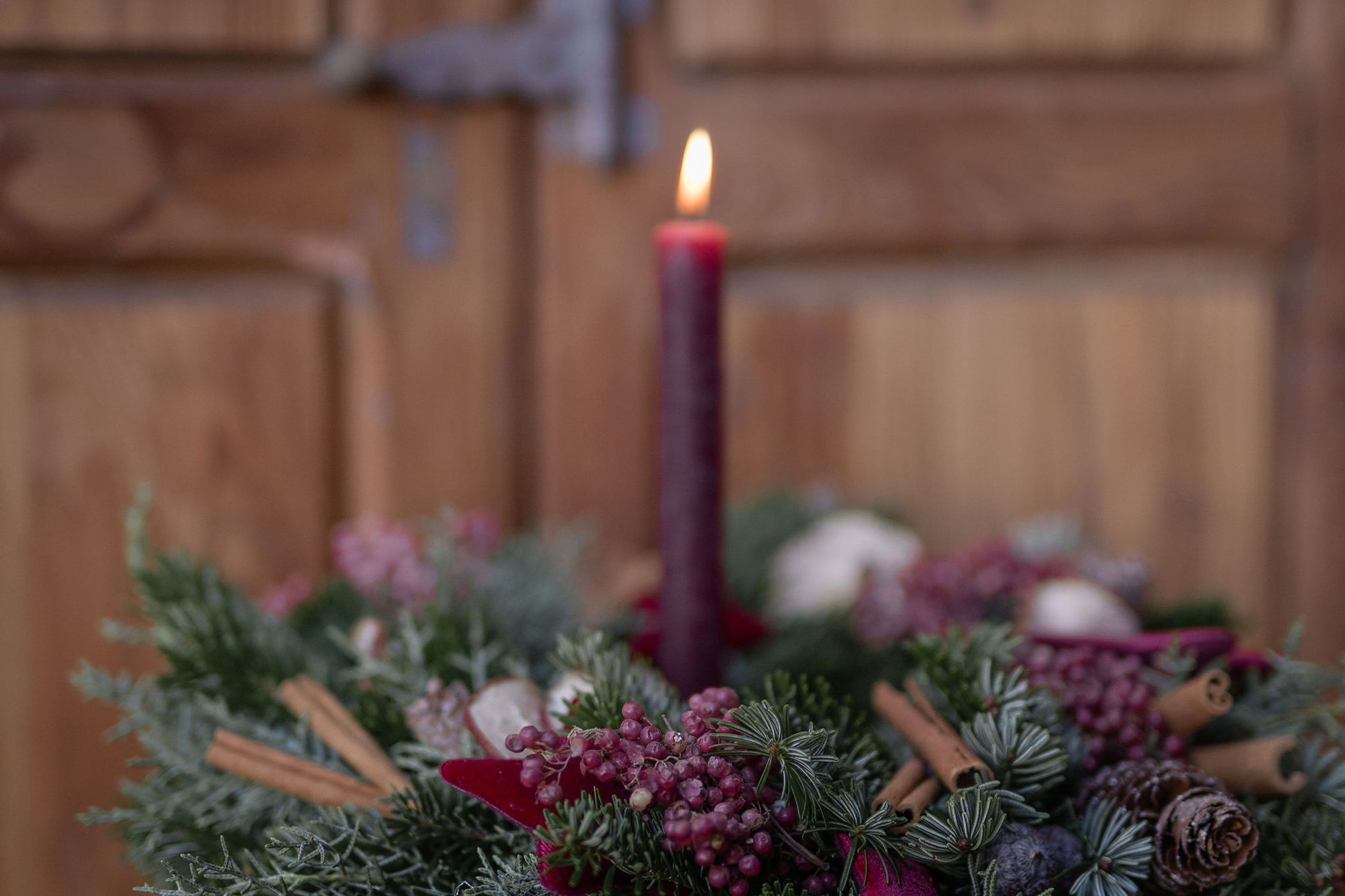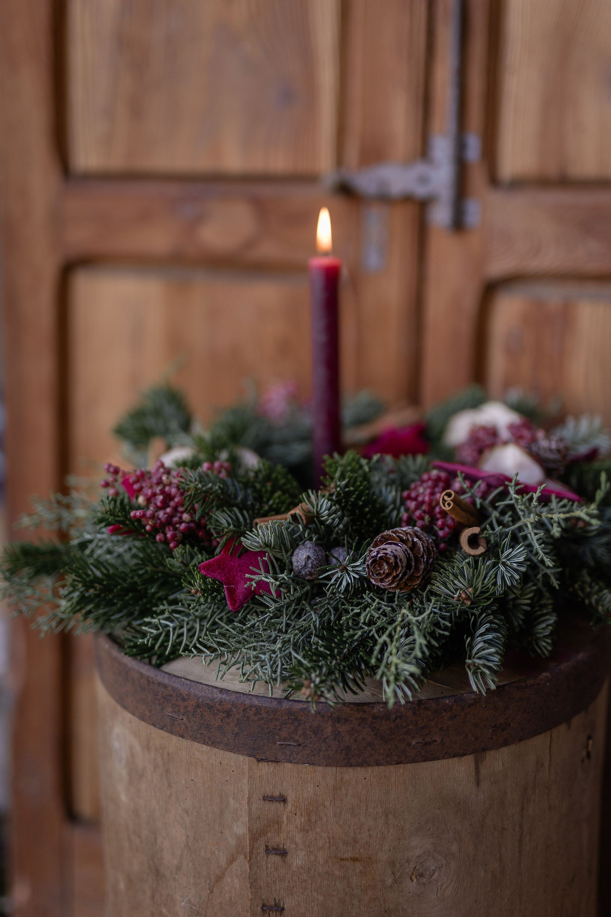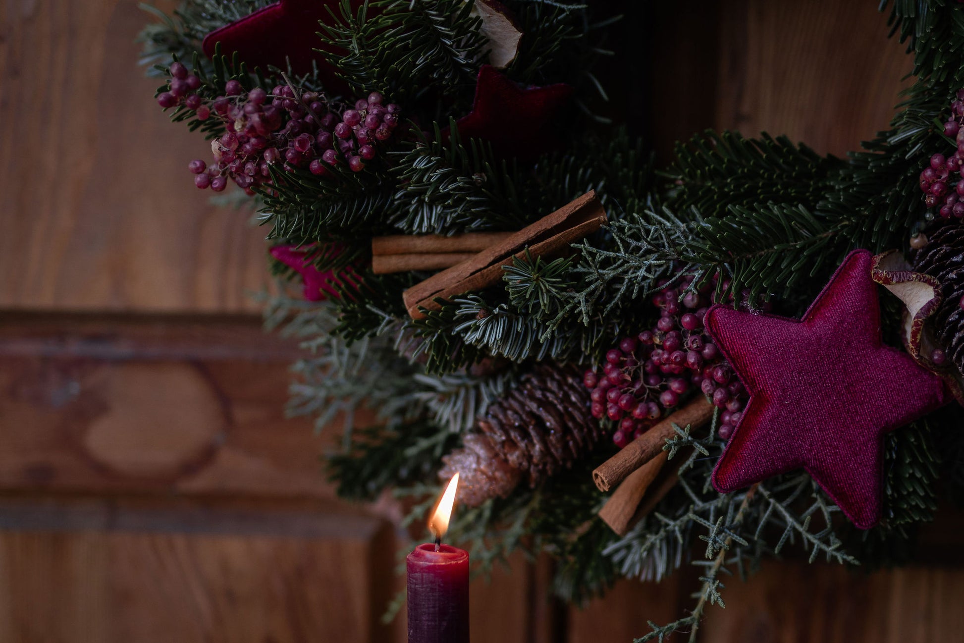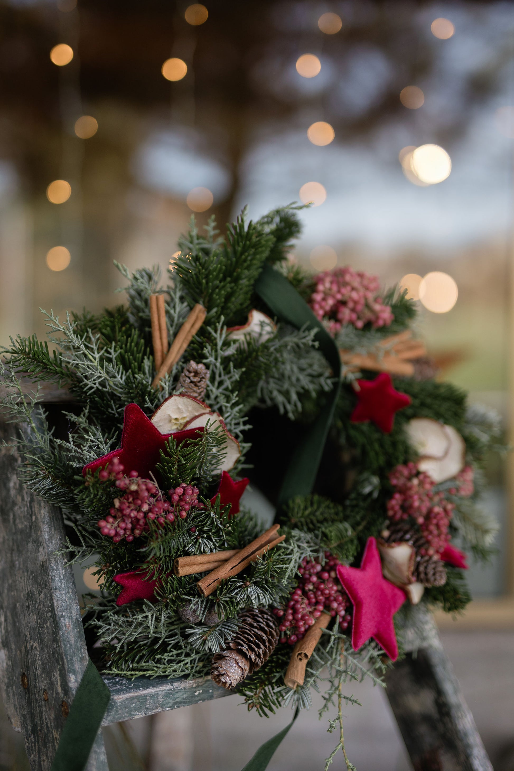 Una ghirlanda intrecciata a mano con almeno due tipologie diverse di verde e decorata con cannella, mela essicata, pepe rosa e delle elegantissime stelle di velluto bordeaux.